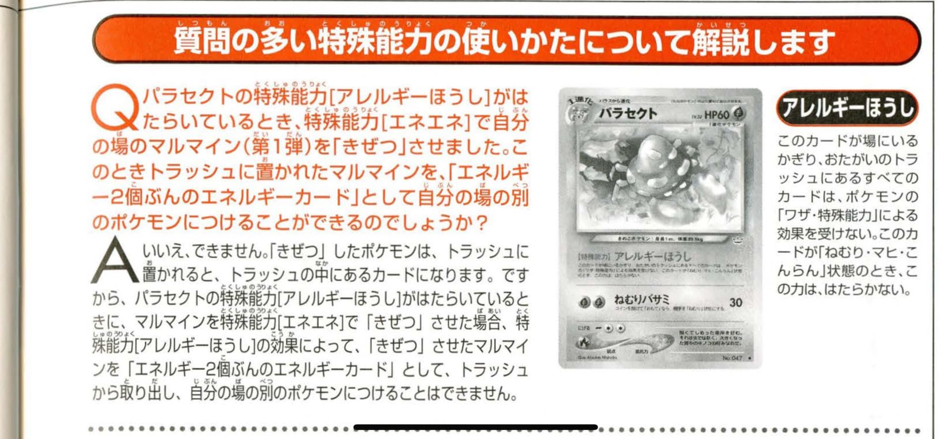 Here’s an interesting one I just stumbled across. According to the PCL Q&A in issue 10 of the official Pokémon Card Trainers magazine, when Electrode (Base Set 21/102) knocks itself out using its Buzzap Pokémon Power, before it gets attached to a Pokémon as an Energy card, it is technically supposed to pass through the Discard Pile. When and why does this matter? When Parasect (Neo Revelation 35/64) is in play. Parasect’s Allergic Pollen Pokémon Power prevents any cards in anyone’s discard pile from being affected by attacks or Pokémon Powers. The official word from PCL is that this includes Electrode, meaning that if you knock it out with Buzzap while Allergic Pollen is live, the Electrode gets discarded and stays there.